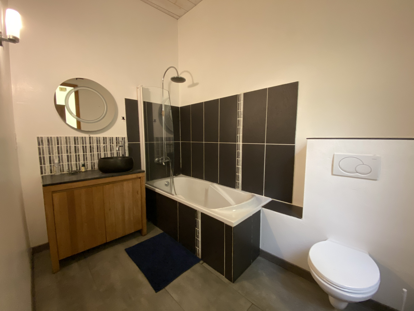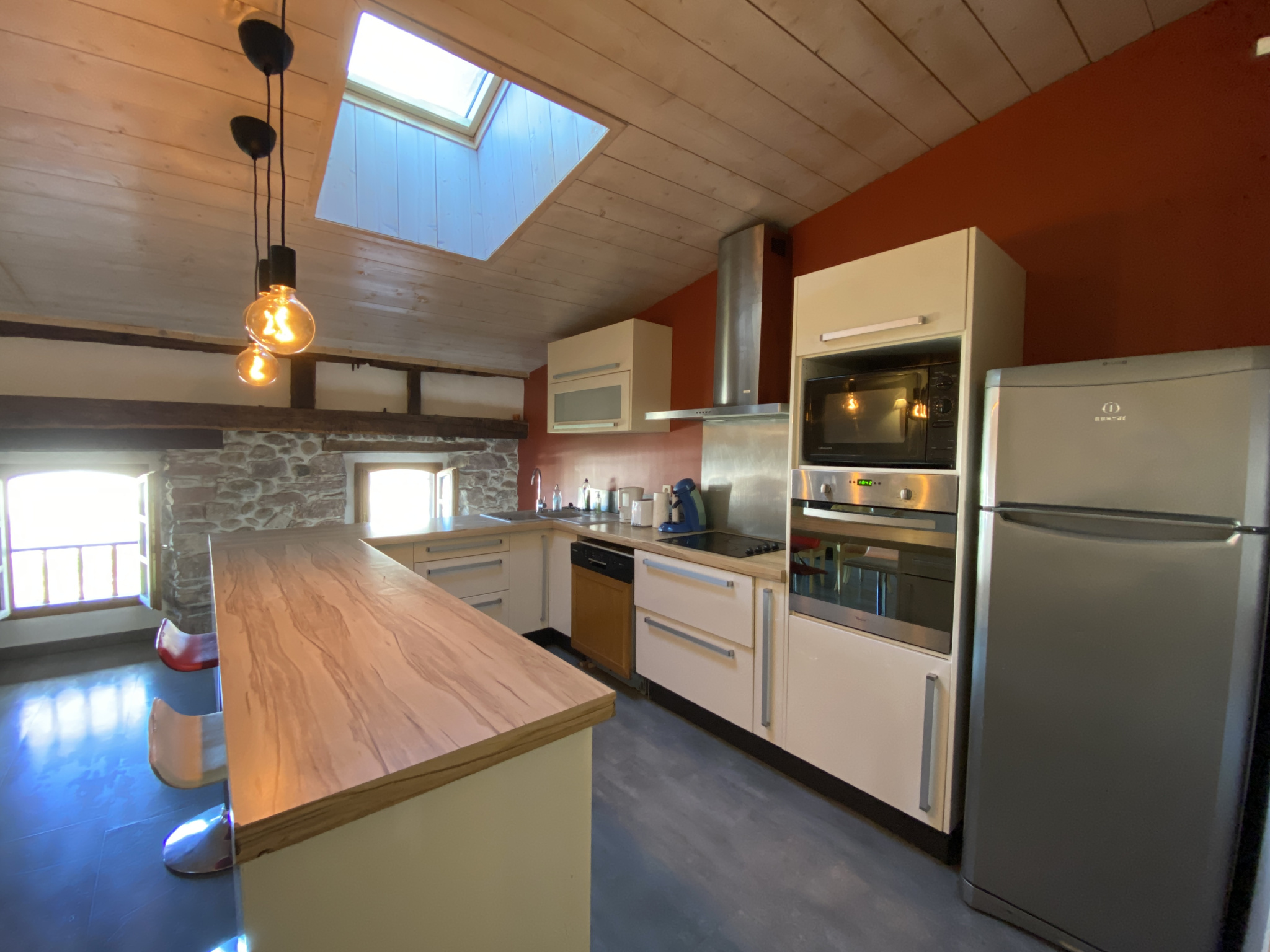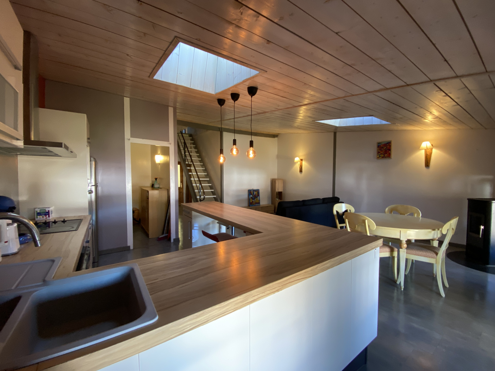 L’appartement offre une belle entrée donnant sur une chaleureuse pièce à vivre, équipée d'un poêle à granulés. La cuisine est ouverte sur le séjour et elle est entièrement équipée (plaque de cuisson, hotte, four, lave-vaisselle). Vous y trouverez également un cellier avec lave-linge, une salle de bains avec WC ainsi qu’une première chambre au même niveau.
