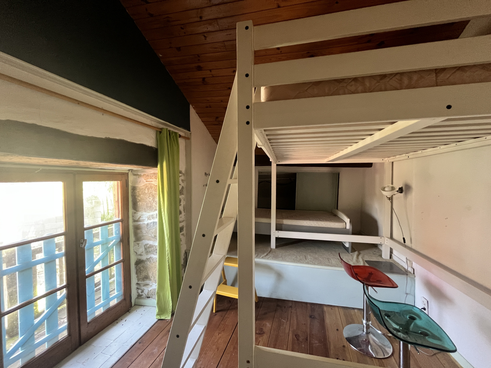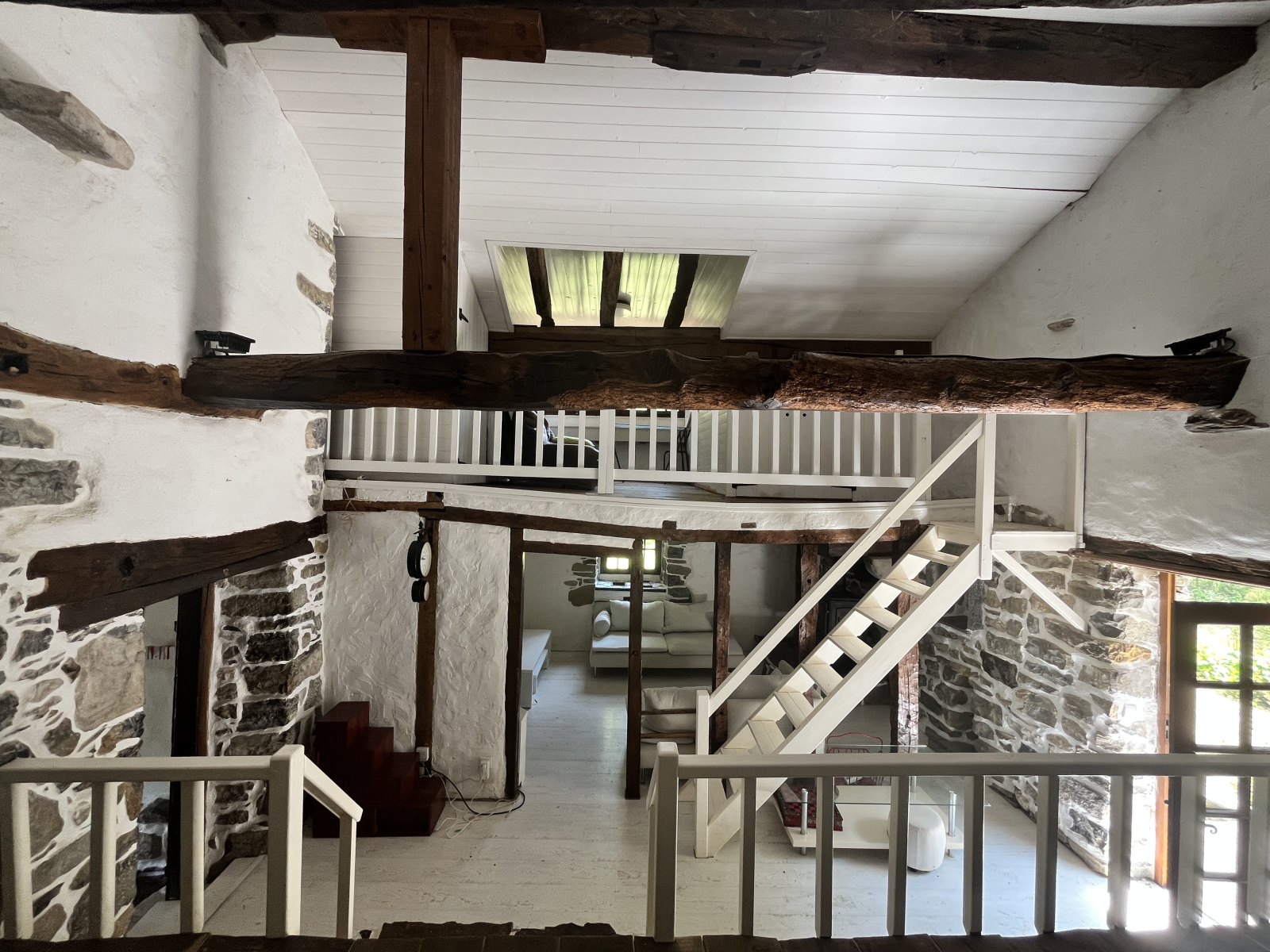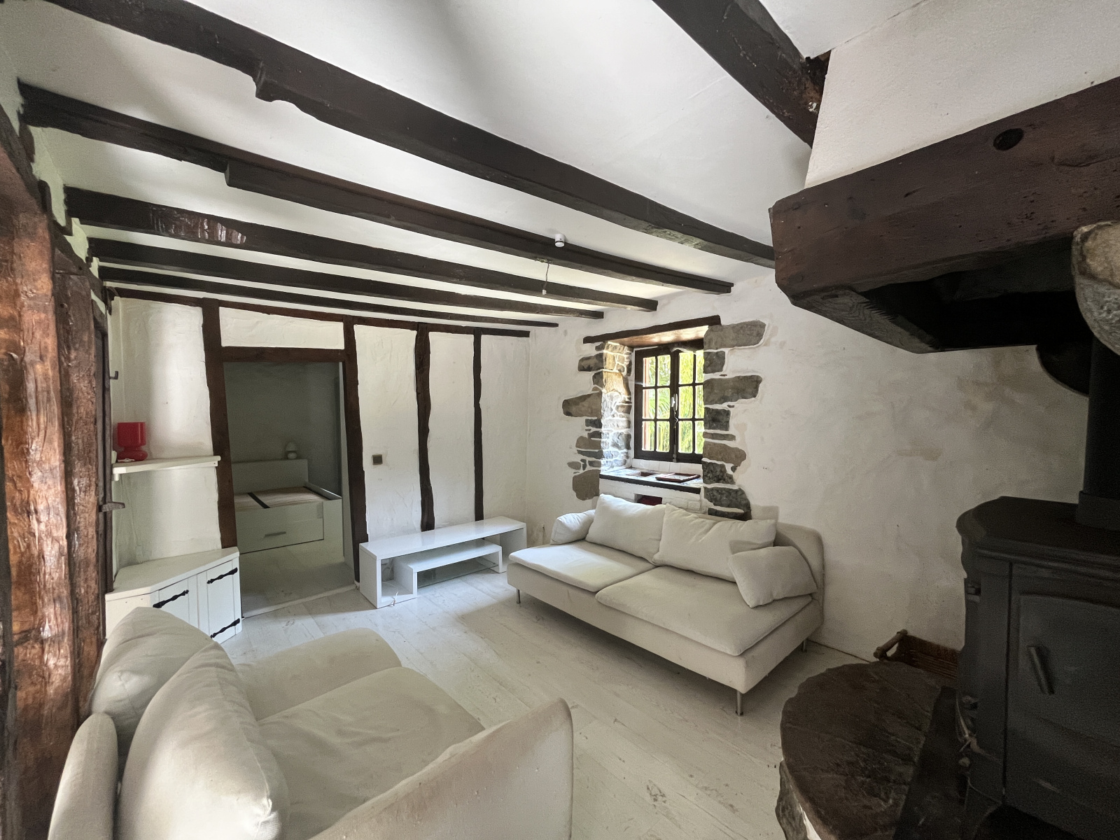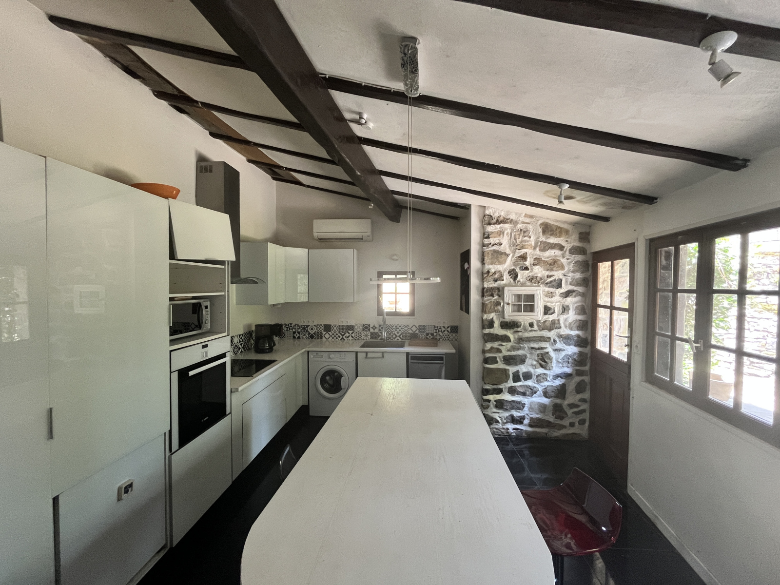L’habitation comprend au rez-de-chaussée: entrée, cuisine indépendante, salon, chambre, mezzanine, salle de bains et WC indépendant. À l'étage, deux chambres mansardées viennent compléter l'espace de vie offrant une ambiance chaleureuse. Côté confort, climatisation réversible et poêle à bois.